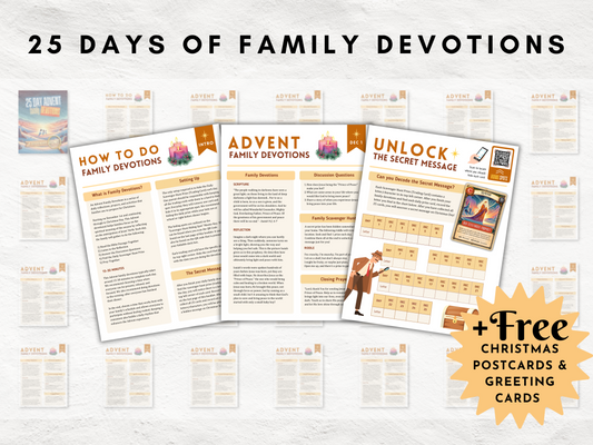 25-Day Christian Advent Devotional Kit | Family Christmas Countdown with Scavenger Hunt, Bible Trading Cards | Greeting Cards | Postcards