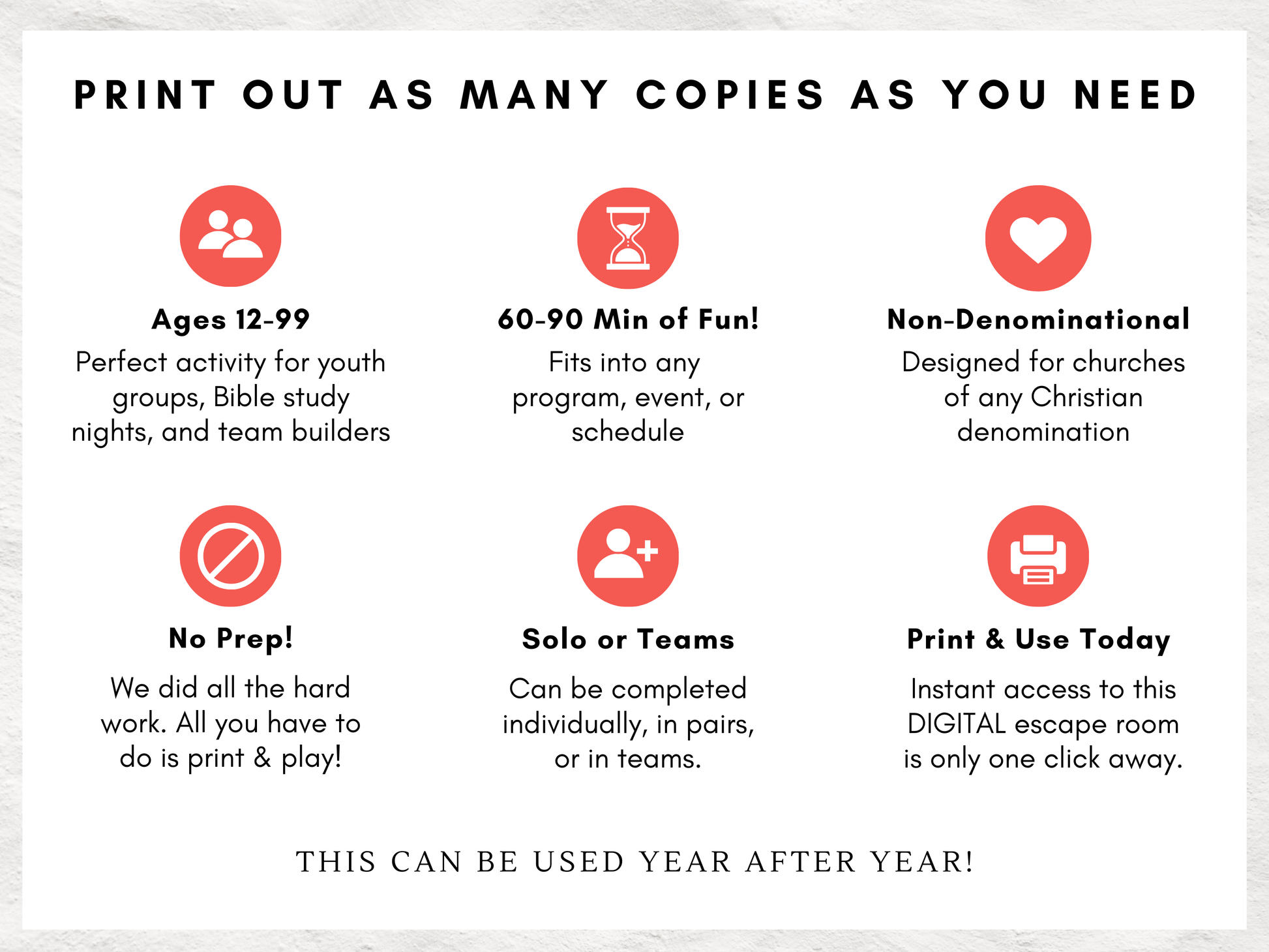 Bring your Bible study to life with this printable escape room adventure that dives deep into James 1:1–18—the perfect faith-building activity for preteens, youth groups, Sunday school classes, or even church staff team-building!