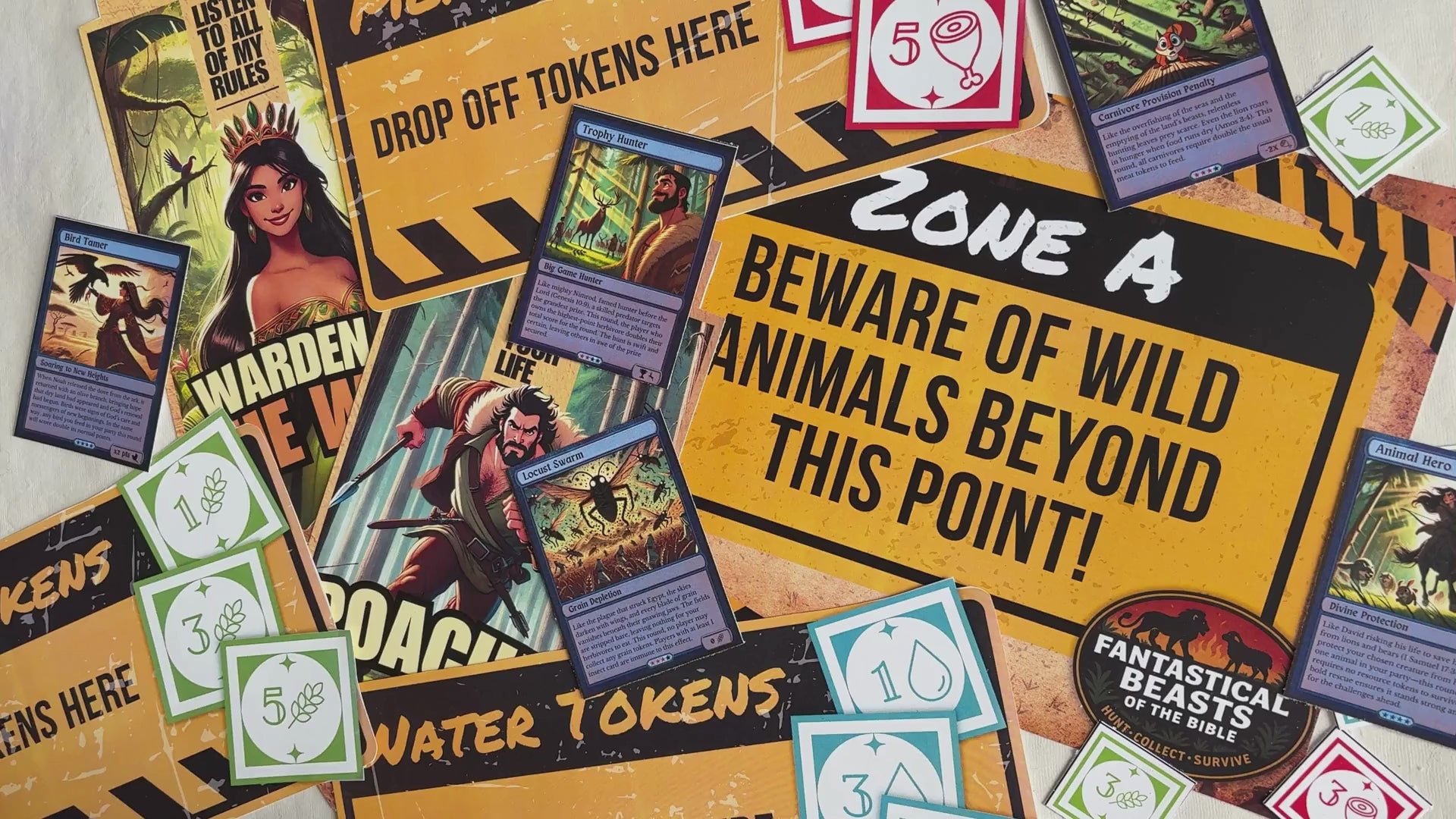 Players race to find hidden Bible animal cards and gather enough resource tokens to “feed” them.