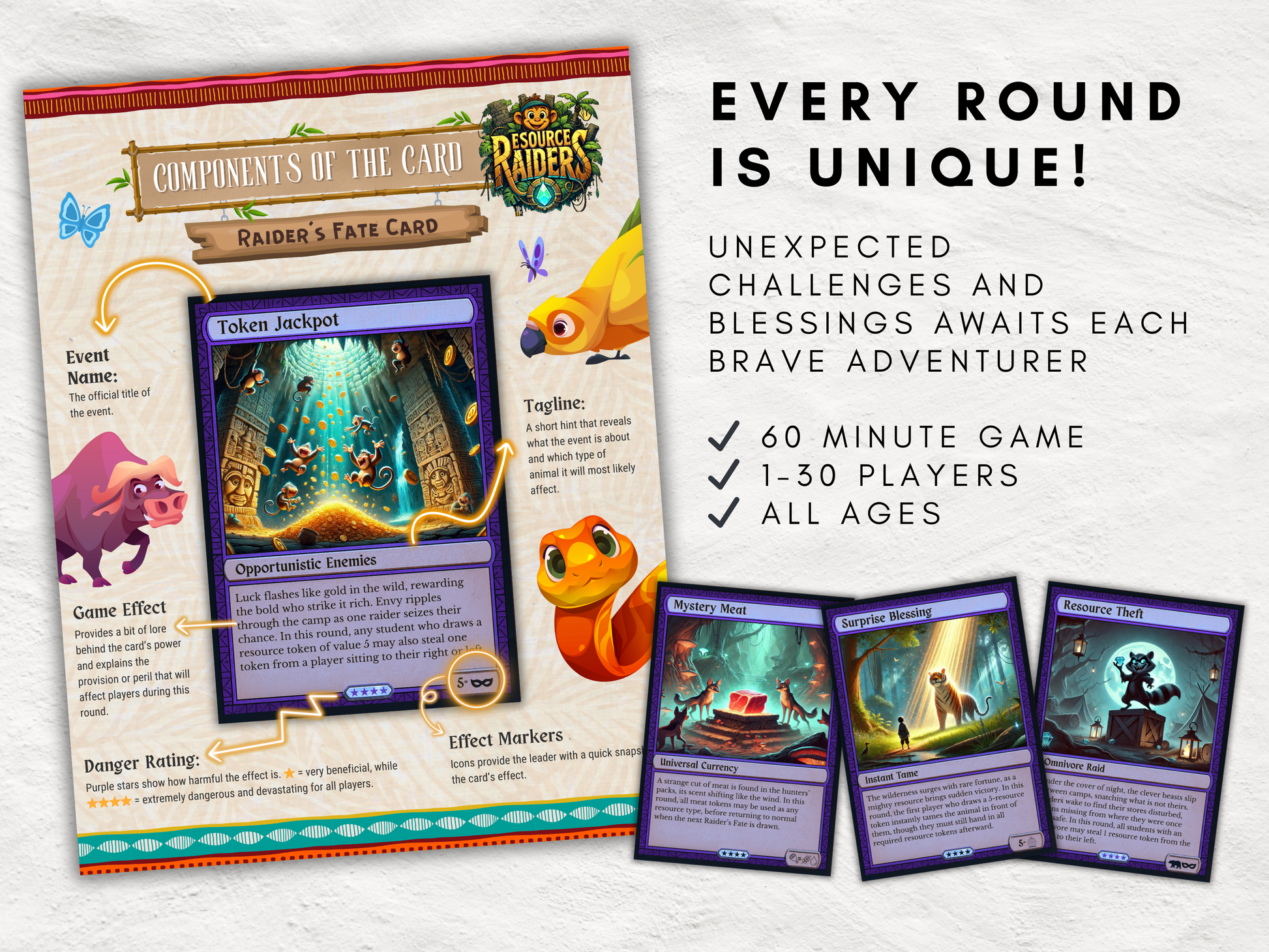 Resource Raiders is a Bible-based classroom engagement game designed for 1 to 30 students. Students earn points by answering questions, participating in discussions, and taming biblical animals using collected resource tokens like grain, meat, and water.