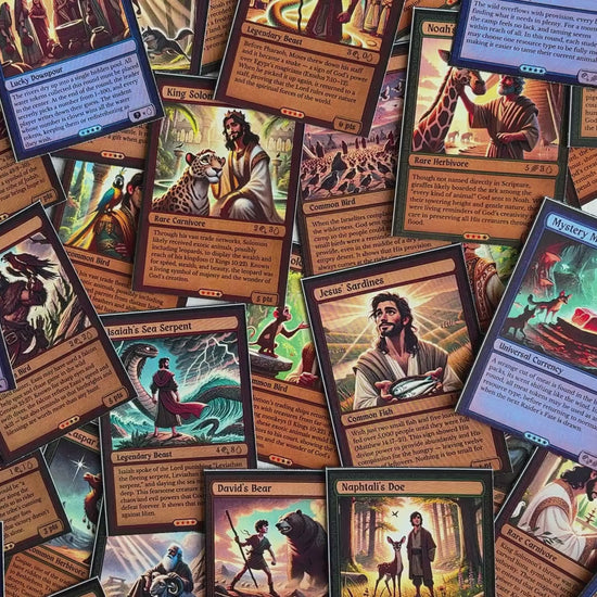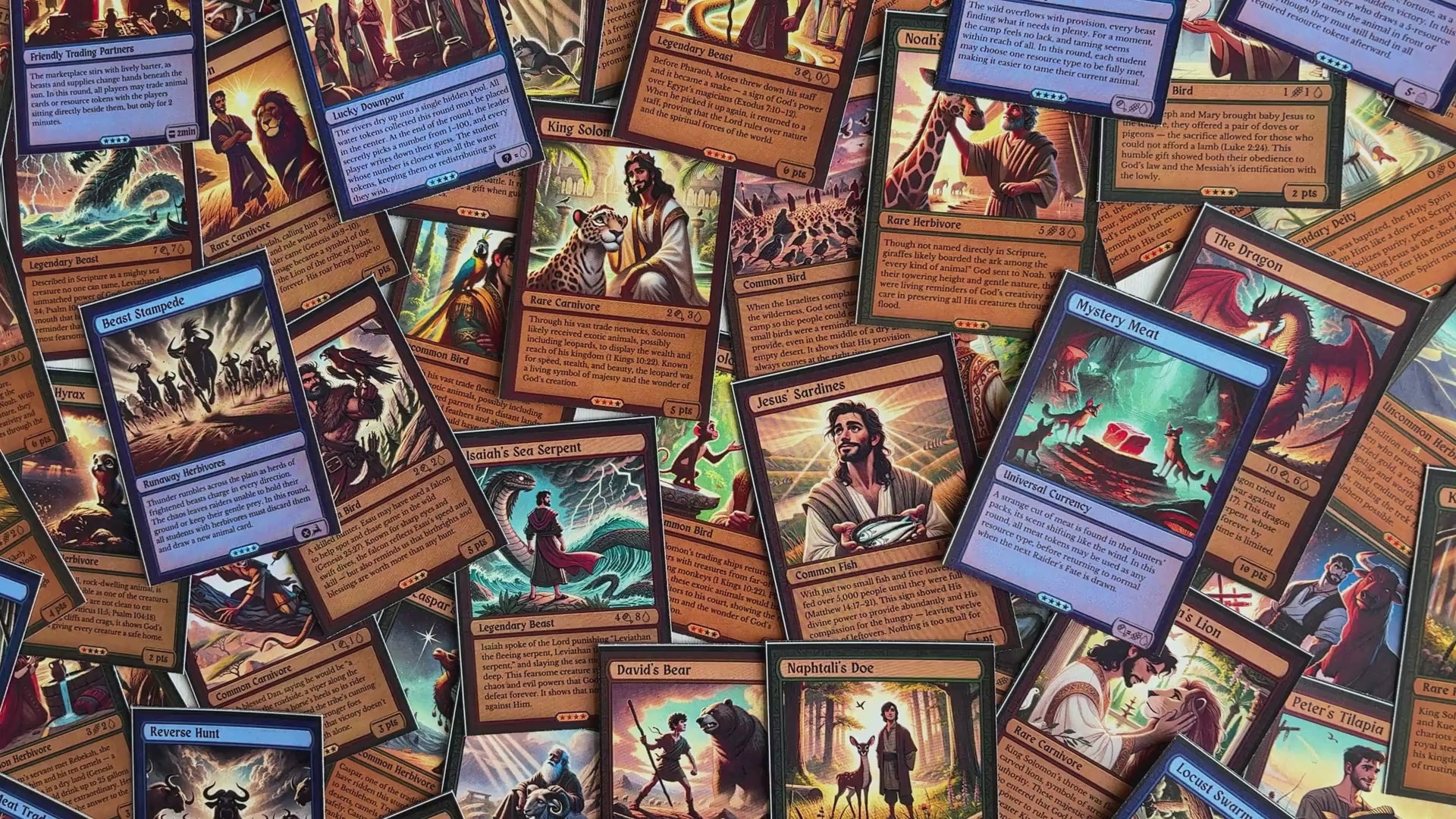 📖 Each card connects a biblical animal to a real story or figure in the Bible, with feeding requirements and point values