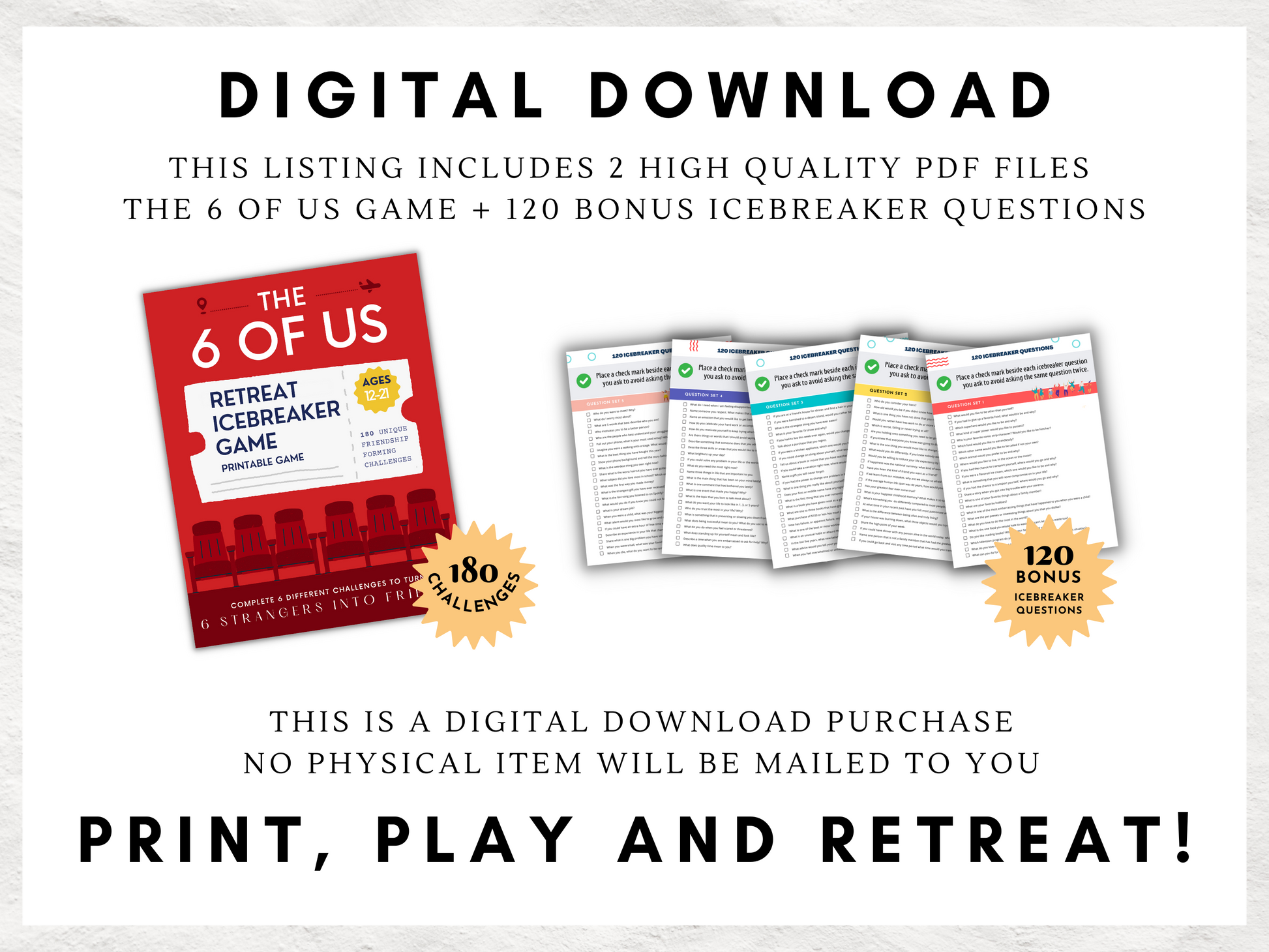 Target Audience: Ideal for those seeking to bond and grow closer during retreats, The Six of US caters to ages 12 and above. It resonates with individuals passionate about forging new connections and making lasting memories. Retreats are a time to meet new people and forge new friendships. This game will definitely help to facilitate that. This game can be scaled to accommodate any group size.