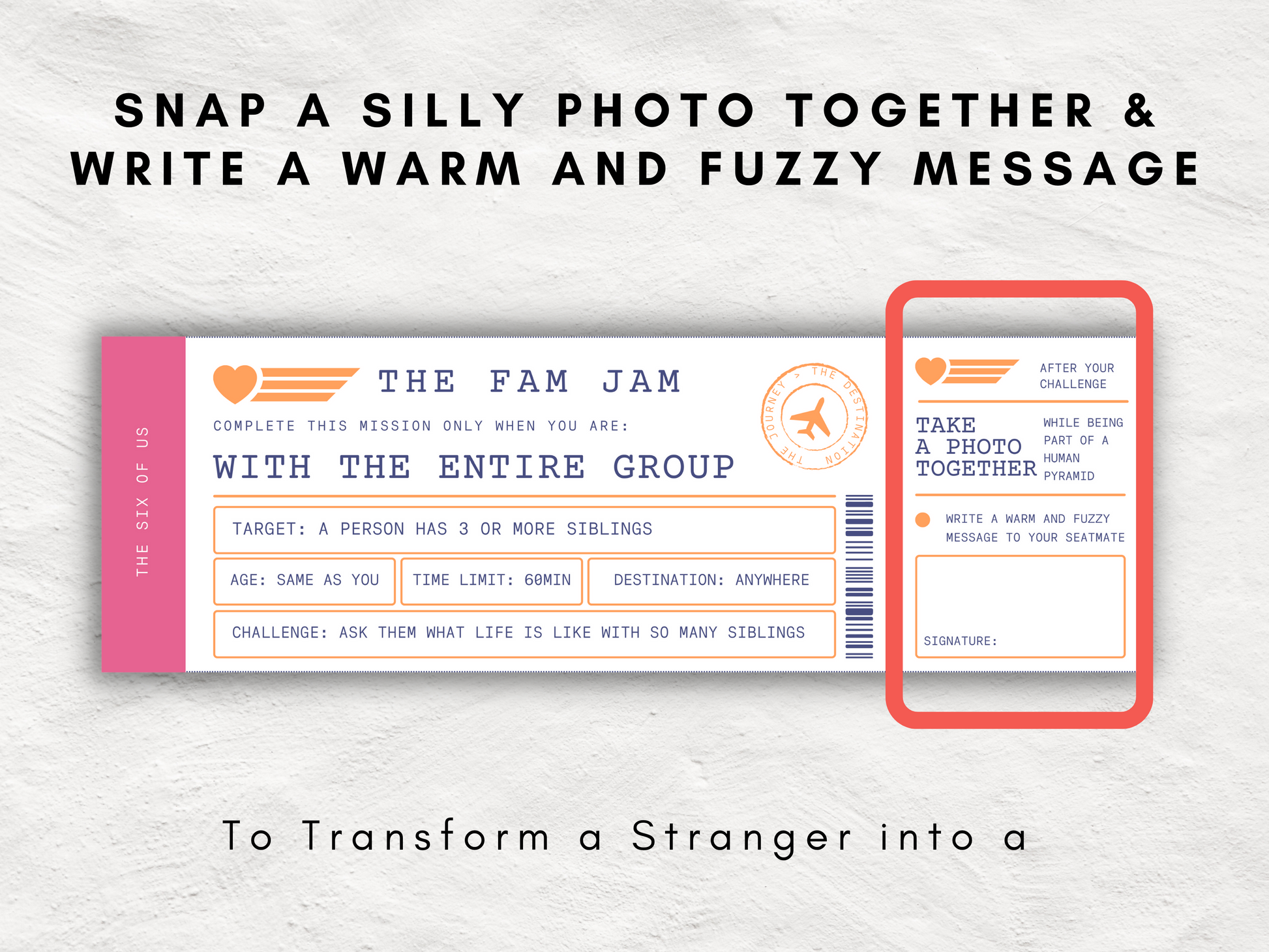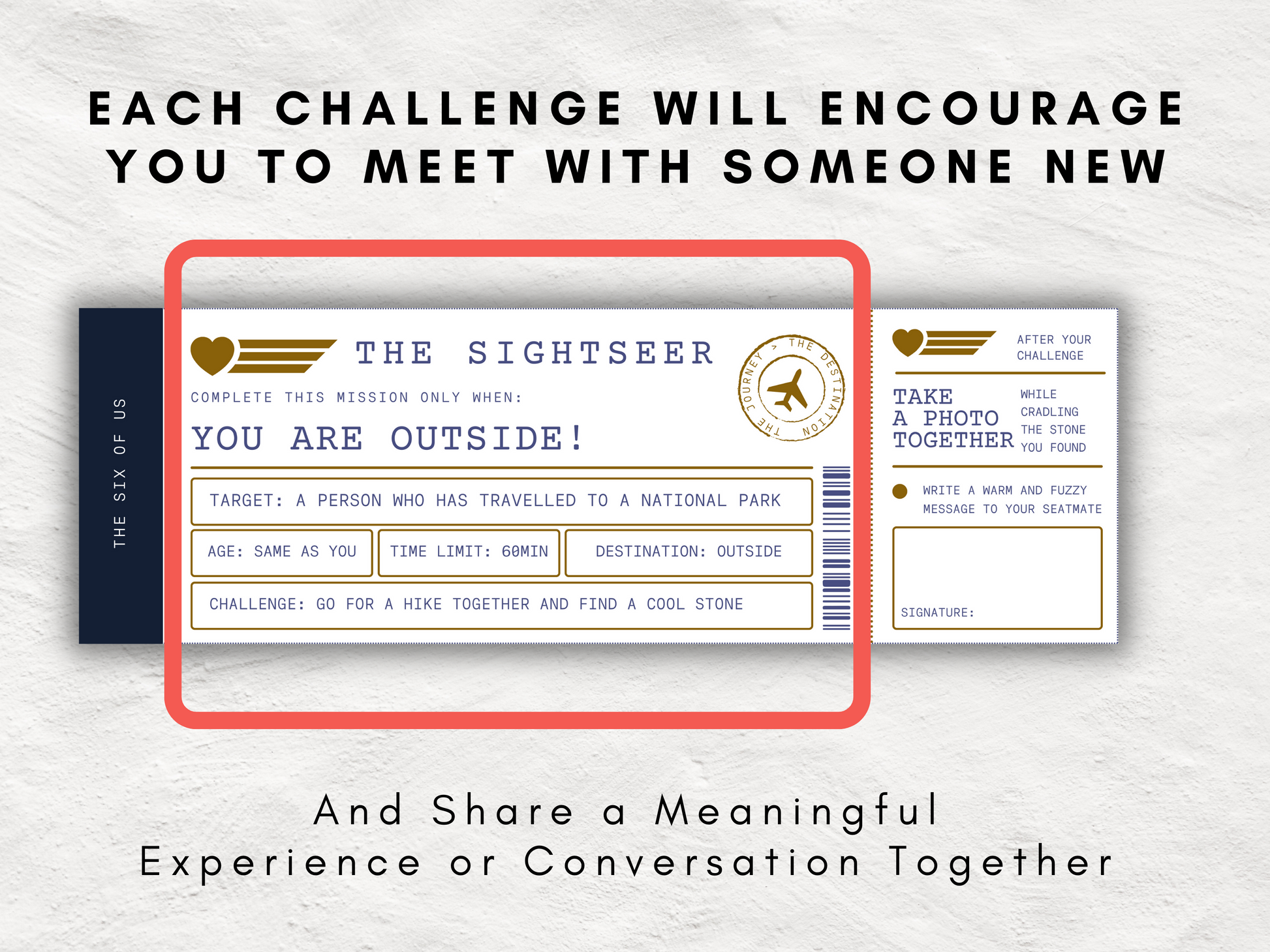 Creation Process: Crafted with care and creativity, each of the 180 unique challenge in The Six of Us is meticulously designed to foster friendships. All players will be challenge to find a specific person to target, complete a fun challenge or have a meaningful conversation, take a silly photo together, and then write and receive a warm and fuzzy message.