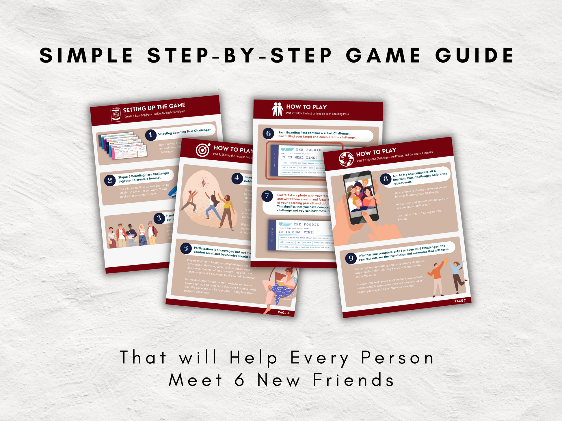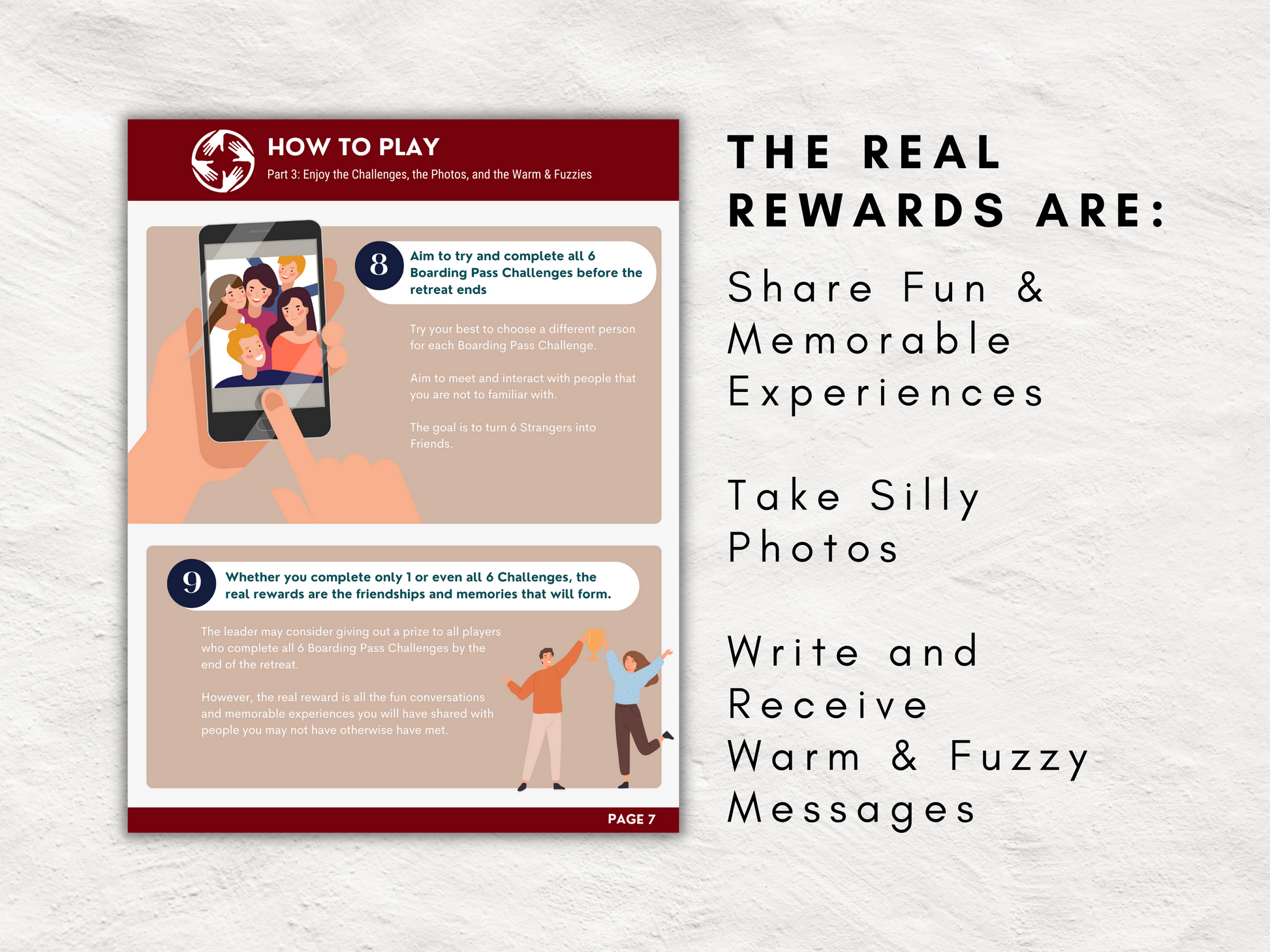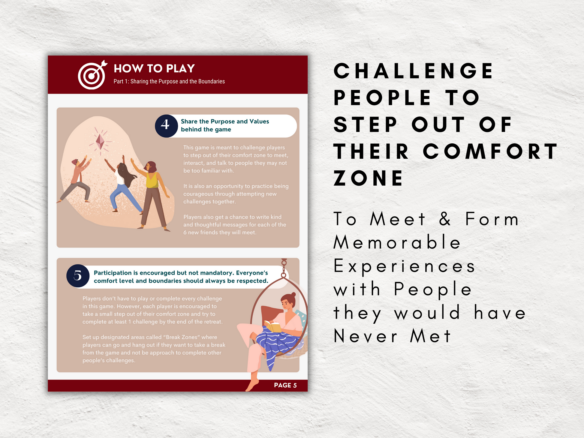 Inspiration: Embark on a journey inspired by the desire to forge strong and meaningful friendships with 6 strangers you meet at retreat. The Six of Us Icebreaker Retreat Game inspires all participants to get out of their comfort zone to meet and share memorable experiences with people they would have otherwise never have met.