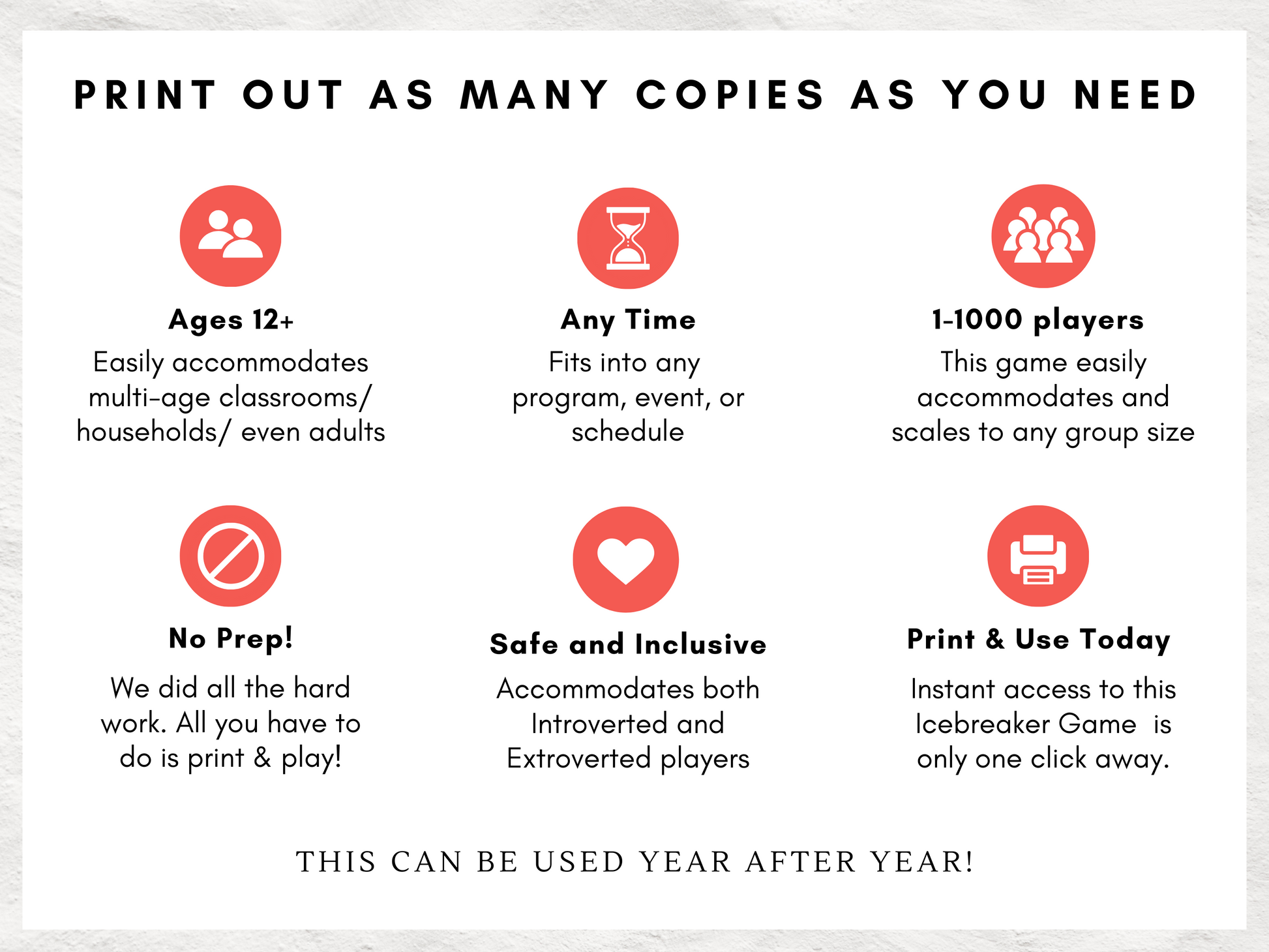 This is a digital and printable game. You can print as many copies as you would like and it can be played year over year. Stop people from being trapped in their cliques and use this game to challenge them to form new memories and forge new friendships!