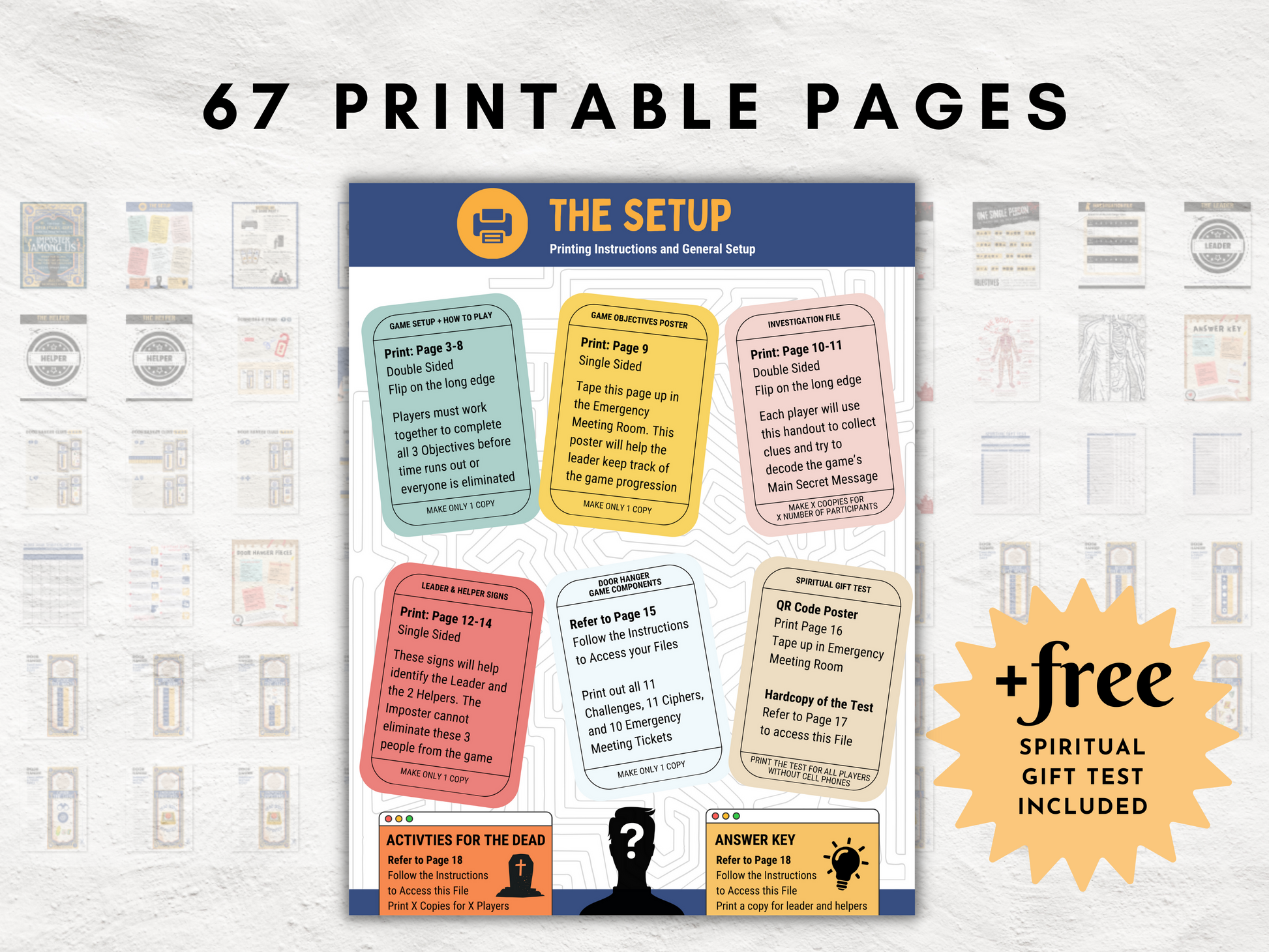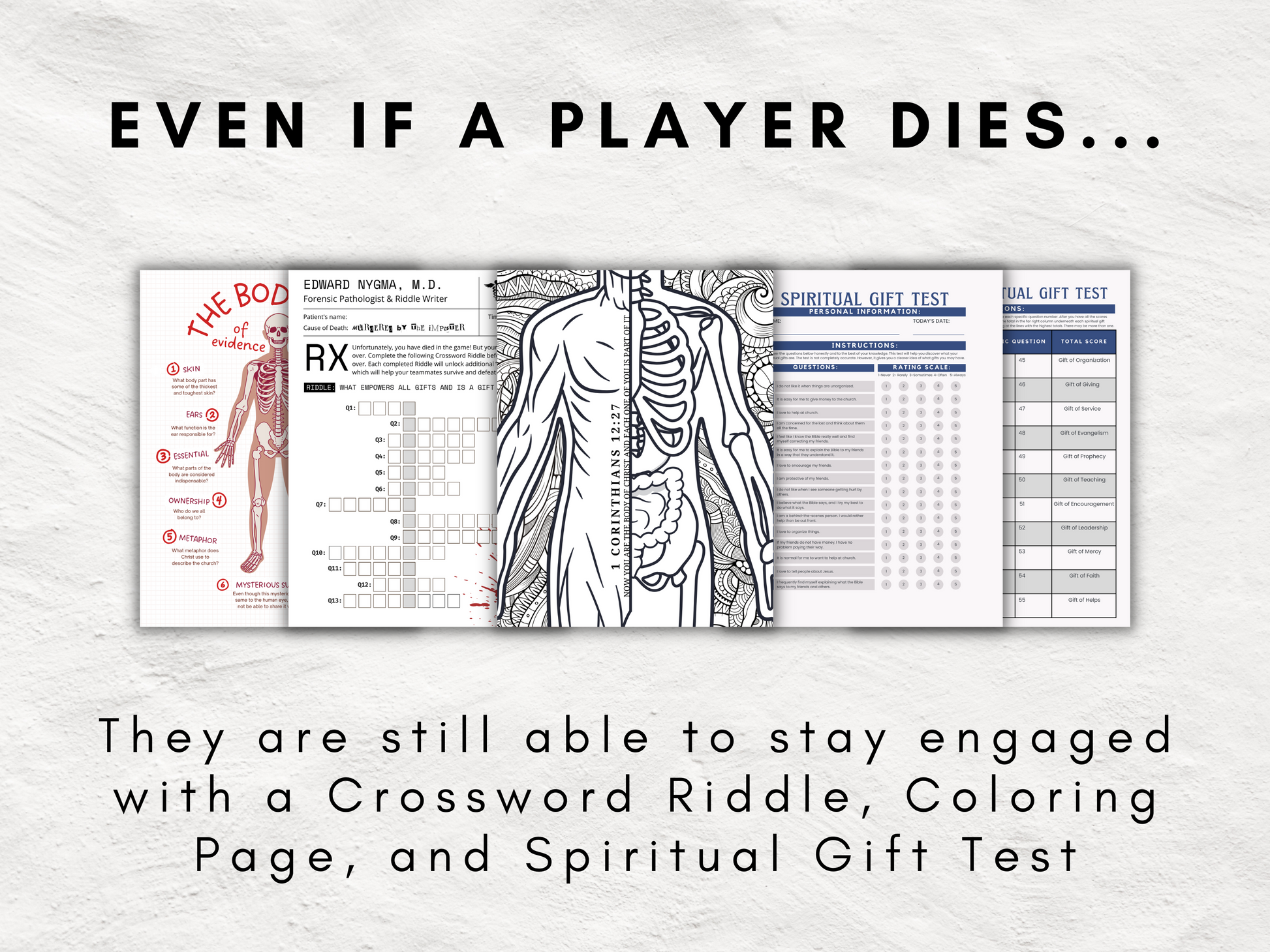 Players who die will still be able to stay engaged in the game. All deceased players can take the time to complete the Crossword Riddle (which will earn additional Emergency Meeting Tickets for the living players), color in the coloring page, and complete the printable/digital Spiritual Gift Test.