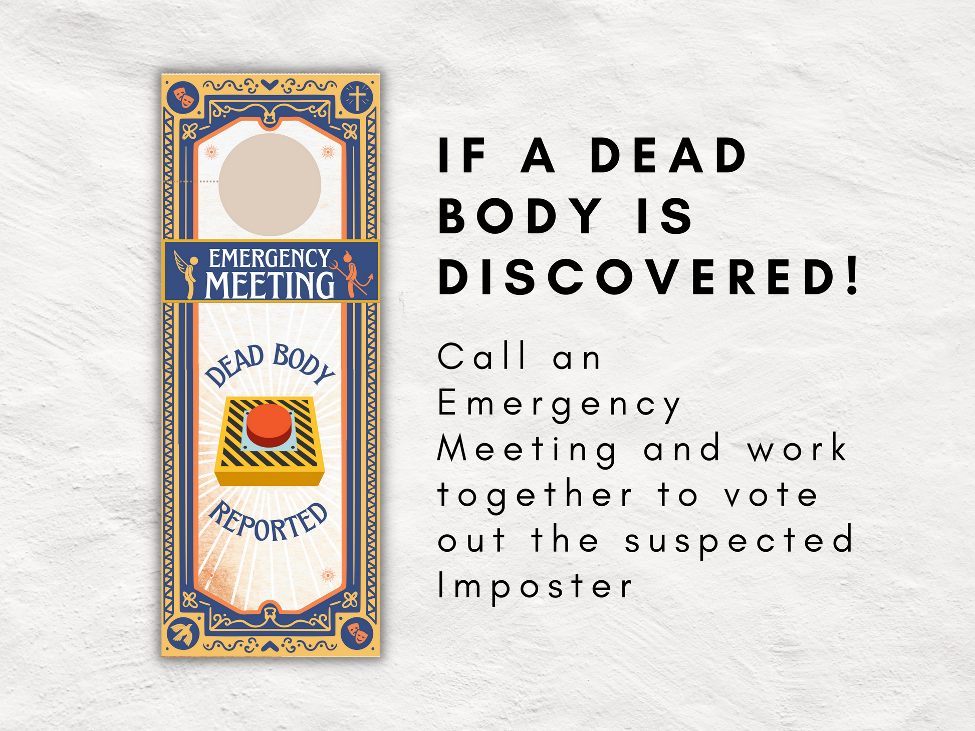 If a player is found to be murdered, teammates must search for an Emergency Meeting Ticket. Once this ticket is found and handed in to the Leader, all players will gather for a quick 5 minute Emergency Meeting where everyone must come to a consensus on who they want to accuse as the Imposter. If they vote incorrectly, they will accidentally eliminate a fellow teammate. If they guess correct, the Imposter will be eliminated!