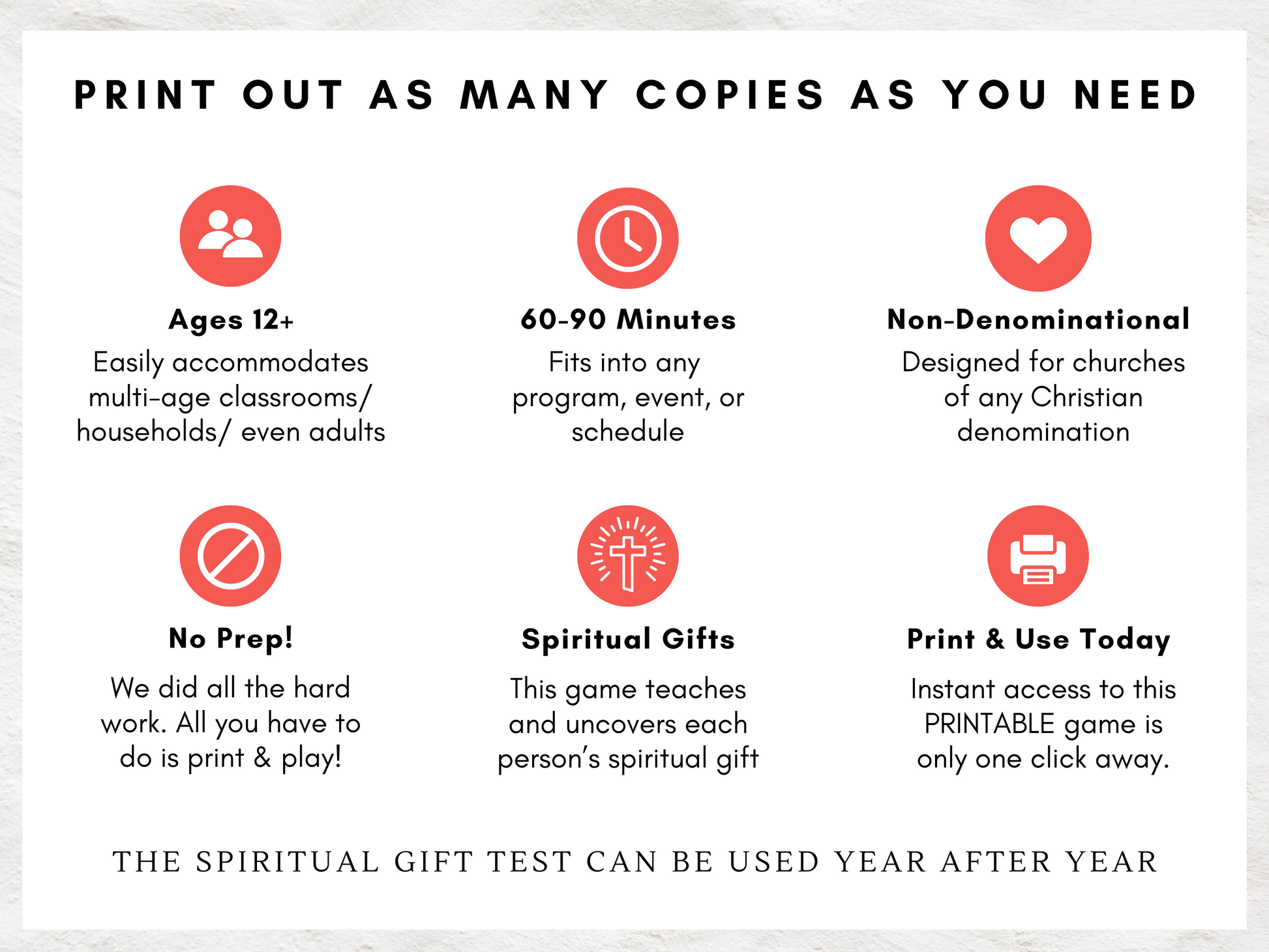 - 1 Printable Spiritual Gift Test (containing 55 Questions)